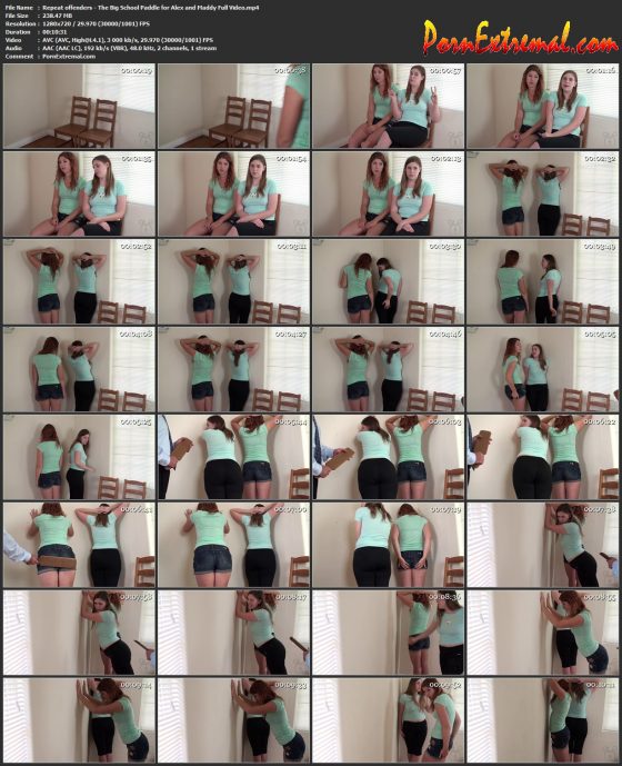 Description: Fresh from their morning Discipline, Alex and Maddie can’t seem to stay out of trouble. Deciding to skip the final 15 minutes of gym class, they are cut and sent back to the office. This time the principal paddles the mercilessly with the biggest paddle hanging on the wall behind his desk. They are instructed to wait with their hands on their head facing the wall. Shenanigans ensue before they are interrupted and subjected to another painful school paddling.