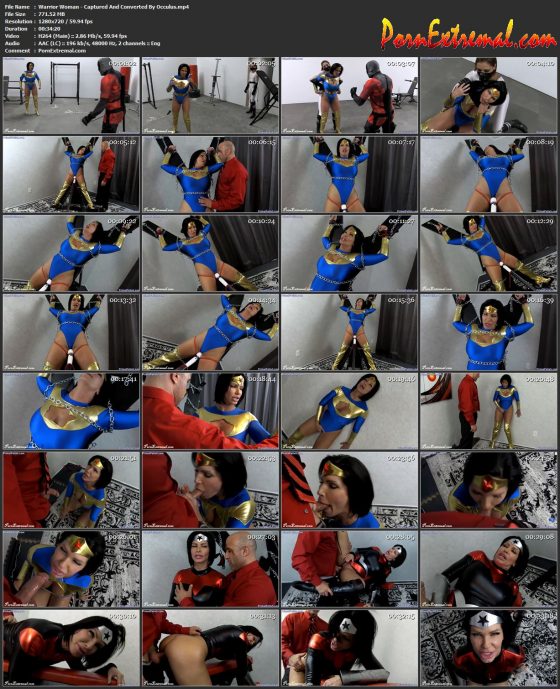 The countries most patriotic superheroines have been disappearing and Warrior Woman has uncovered that the Intelligence Agency known as Occulus is responsible. No longer protected by the government now that thier illegal activities have been revealed Occulus has gone underground. Warrior Woman won’t rest until all the missing Superheroines are freed. Following a lead she is ambushed by the mercenary DeathStrike. Despite the mercs weapons and skills only his healing power keeps WW from ending the fights in seconds. But he was just a distraction and WW gets hit by a tranq-dart by DS’s partner White Cobra. WW gives a brave effort and isn’t defeated easily but she is eventually overwhelmed. WW wakes to find herself heavily bound in titanium chains. Watcher plans to convert her and uses a powerful orgasm inducer to weaken the superheroine while a mantra of obedience is implanted in her mind. WW’s mind momentarily goes blank and when she comes too she is unchained but discovers Watcher has her under his power Warrior Woman is forced to do the unthinkable, dropping to her knees, crawling to Watcher and proving her obedience with her mouth. WW is now converted, she is in the new uniform with which she will serve Occulus, but before her first mission. Watcher takes advantage of his control and demonstrates to WW that she has no choice but to obey. This scene showcases Shay Fox as knock off version of Wonder Woman. Bound and forced to climax, WW is ordered to suck her captor’s cock, and finally after her turn to the dark side is complete, fucked and facialized.