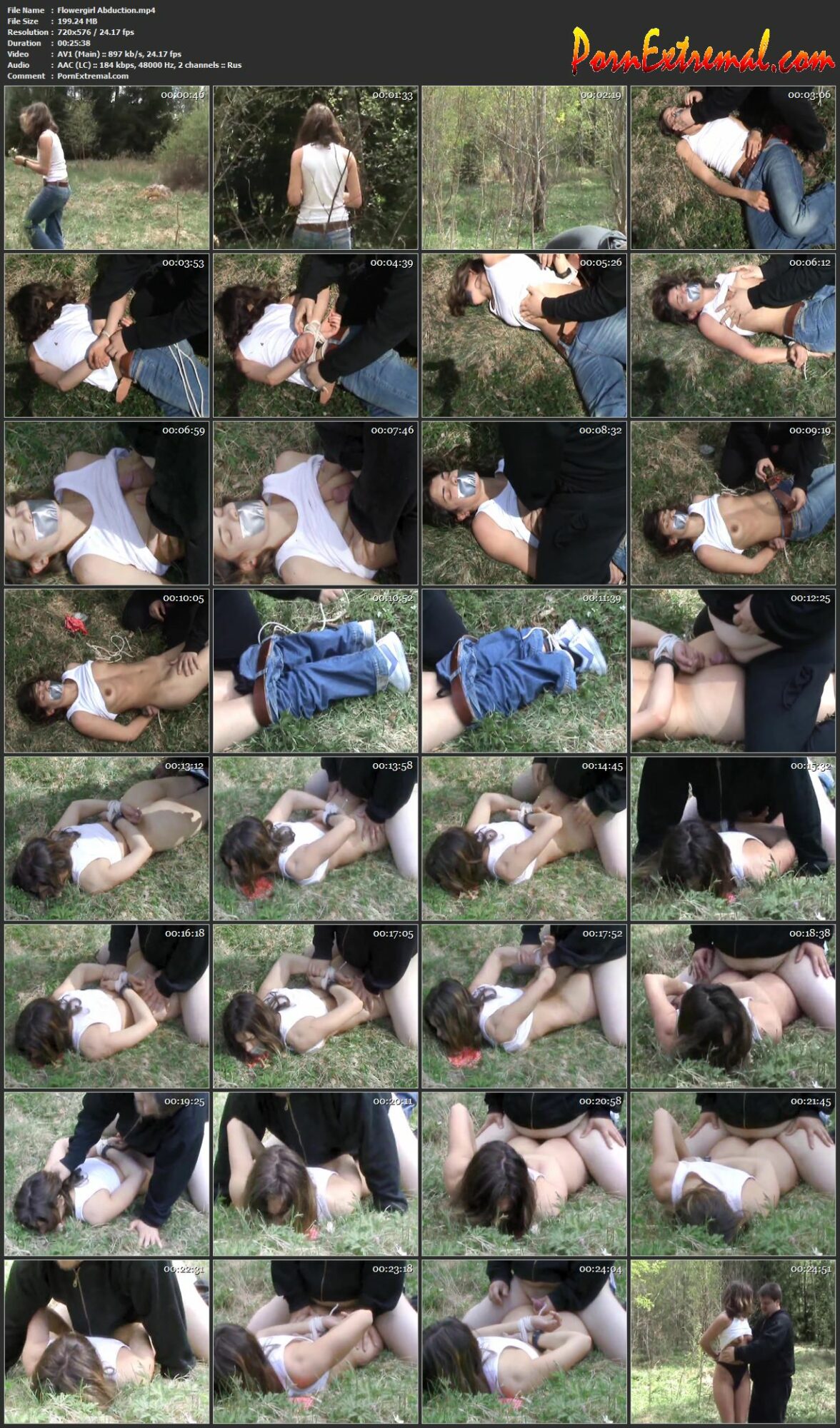 Posted by PornExtreme on 20 March 2026, 09:15Description: Juliette walks through the forest, searching for some flowers. She doesn?t see the man waiting for her behind the trees. As he comes out it?s too late for our damsel. She gets overpowered and chloroformed. Now it?s time to see what a catch he did. He lifts her shirt a touches her breasts. But he want more! He puts out his dick and does a breast fuck for his pleasure. The cpator has Juliette tied and gaged. Now he rubs his cock at her boobs, but he want more. He pulls down her pants. Then he ties her feet with ropes. He fucks her from behind without mercy against his victim. He lifts her arms once again high up in the air. The pain of this let Juliette scream into her gag. Nobody will hear her deep in the woods. After the captor has load his cum right on Juliettes ass he decides to take her home for more fun. He wants to enslave Juliette. So he lifts her up and carries her over his shoulder through the woods. Will Juliette escape or will she ends at the slavemarket