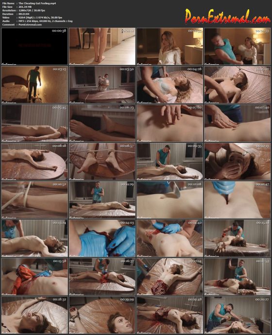 A deceived husband takes revenge on his unfaithful wife. During an argument, he delivers a strong blow to her jaw, causing the girl to lose consciousness. pornextremal.com A crazy idea is born in the cuckold’s head. The husband drags the cheater onto the table and stabs her several times in her beautiful belly. Enraged by the blood, he tears out the intestines of the resisting victim while his wife dies.