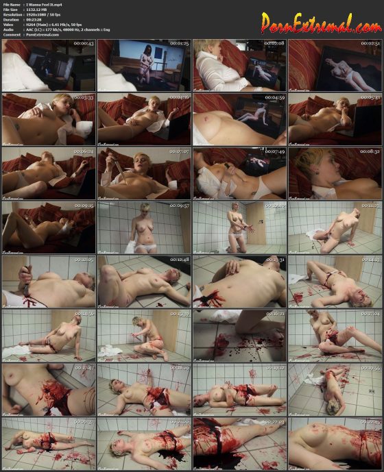 Description: Saphyra is watching a video that turns her on. She gets excited and wants to know how it feels to stab her belly with a large knife.