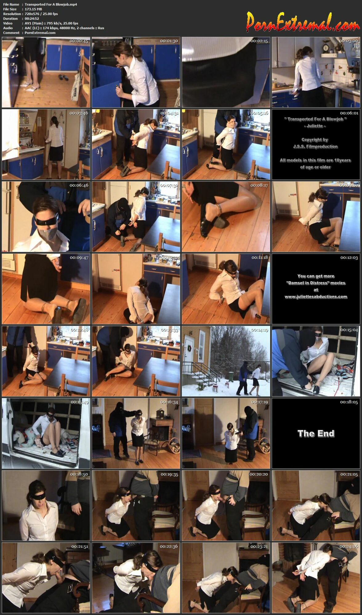 Description: Juliette comes home from work. She’s very sexy in her secretary outfit. She starts to make herself some food as it knocks on her door. She asked who it is, but nobody answers. So she opens the door. A big mistake! A masked man rushes into her house and holds a weapon right to Juliettes face. She has to kneel down and the man starts tying her up with ductape. Now the man blindfolds Juliette with more ducttape. He also puts anklecuffs on her. So she can’t run away while the man searches some jewels and money. Juliette struggles and tries to untape her hands. She is still tied up as the man comes back. Now her jorney into slavery begins. Now Juliette is down on the floor, tied with tape, blindfolded and wearing anklecuffs.