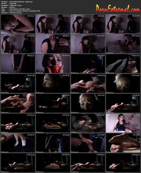This is probably my masterwork up to now; it’s more of a short movie than a fetish clip, and it’s hot, not only for foot fetish fans! Bendy is on death row: she will be guillotined the next morning. The headsman comes to visit her in her cell, and tries to comfort her. tries to talk to her, make her feel better; he feels sorry that such a and beautiful girl will be executed the next day. Before leaving he hands her a drink which will help her to sleep that night. Later we see Bendy sleeping: she is having some disturbing dreams. She dreams about the next day, her last moments, and that nice and kind headsman guy who has turned into a rude creep: he rudely gags her tight with tape, walks her to the guillotine and straps her down paying minor attention to her. Once she is all tied up, unexpectedly, she feels his hands taking her sweet shoes and socks off. She freaks out, but there is little she can do: he is groping and worshipping her feet, causing her to grow anxious and scared, but he doesn”t care. She is tied up and gagged, and will be dead soon, so he takes all his freedom with these feet, ignoring the scared and desperate sounds coming from her. She realizes that, and slowly turns into resignation, still fighting, but letting him do what he wants… Still playing with her feet, he suddenly lets the blade drop and she goes with a sweet scream. He keeps worshipping the headless body”s feet, which have turned limp and passive since the blade dropped.