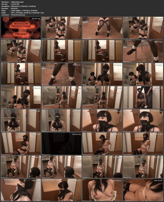 En naken, bundet brunette, bundet til en stol og fratatt oksygen, dør sakte av kvelning mens bøddelen leker med den nydelige kroppen hennes.