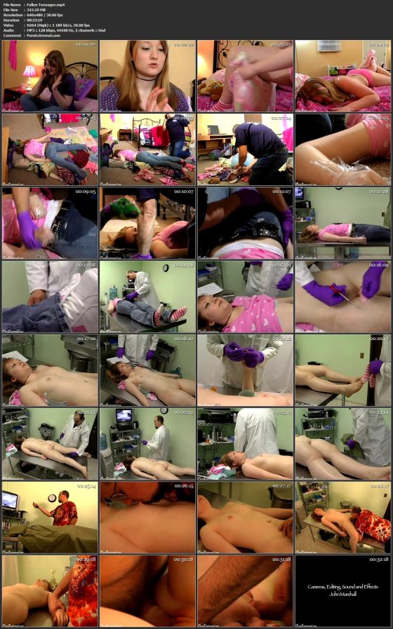 Now, fully naked, he starts to check her body over thoroughly. When he gets to her vagina, he uses his UV light to check for fluids. He spreads her pussy lips wide, making sure he can see all he needs too. He then scrapes her nails and rolls her body onto it’s side, then completely over. Placing a thermometer in her rectum, he checks her temperature and make notes. Finally, with her on her back again, he makes some last notes and leaves the room. Later that evening after everyone has left, he comes back in to further explore this young teenagers body. He starts by sucking her breasts and starts to finger her as well. He then licks her pussy for a while before using her hand to massage his penis. Soon he is fucking her body before cumming all over her mouth