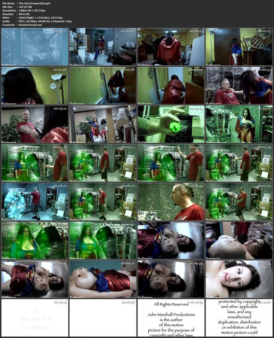 Supergirl enters a remote warehouse looking for a kidnap victim. But when she finds him, he turns out to not be who he says. After shooting her several times–bullets bouncing off, she asks him why. He tells her that he knows she has certain information and that he was paid to extract that info. Supergirl finds this all humorous, flicks the gun out of his hand and tosses him across the room. But, she is surprised by the glowing kryptonite sphere he pulls out. She is weakened and he places her in a kryptonite powered status field. She is barely able to move as he tortures her for the information. Every time she won’t tell him, zaps her with and electric shock fused with kryptonite particles. She is weakening fast. Luckily, he has a back up plan. He shoots her in each breast and when she still refuses to tell him, he shoots her 4 time in her supergirl logo. As she dies, mouth open, eyes staring, she is held in place by the status field. He shuts it off and he catches her when she falls. He carries her to a table in a nearby room and pulls her top down to expose the holes in her chest. He takes a photo to send to his clients and leaves
