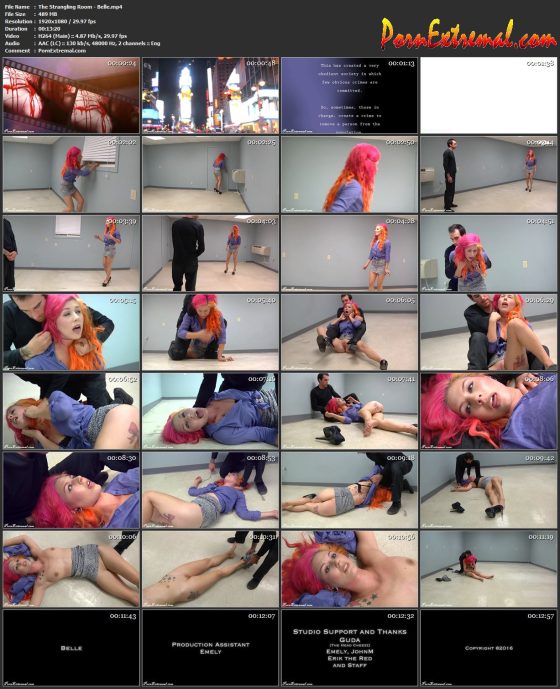 The future holds an over populated nation and crime is used as a way to eliminate those who are not compliant of the rules. This has created a very compliant society. However, those who choose not to obey and become “free thinkers” end up in. The Strangling Room… This is exactly where the beautiful young Belle adorned with bright pink and purple hair has found herself! Unlike the rest, Belle committed the crime of thinking for herself and must be punished so she was abducted off the streets, thrown into a van and brought to her fateful demise. As Belle is preplexed looking for a way out of the room a man dressed in all black shows up and his stone silence is creeping Belle out! “Tell me what is going on?!?” Belle pleads. “You can’t just take me off the streets and lock me in a room all day! I don’t even care that I missed important meetings all day I just want to go…” As Belle tries to walk past the man he grabs her by the neck placing a rope around her supple and soft milky skin. Belle tries to fight off the man kicking and struggling, but her efforts are in vain as she drops to the floor. She is still kicking and gagging but all movements come to an end as she looses her life. The man undresses her stripping her clothes off and exposes her large perky breast and young beautiful body before he walks out to his next job.