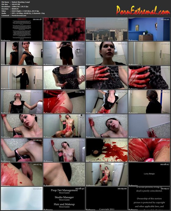 A woman is watched as she enters the bathroom. A contract killer waits for the right moment. She is relaxing on the toilet when her stall burst open and he shoots her through the right breast. Blood pours out, she pleads, he shoots her in the gun–more blood. It’s everywhere. She is starting to weaken and looks up, pleading once more. He shoots her in the head–ending her. He goes in, tears her shirt off and leaves her sprawls, bloody on the toilet.